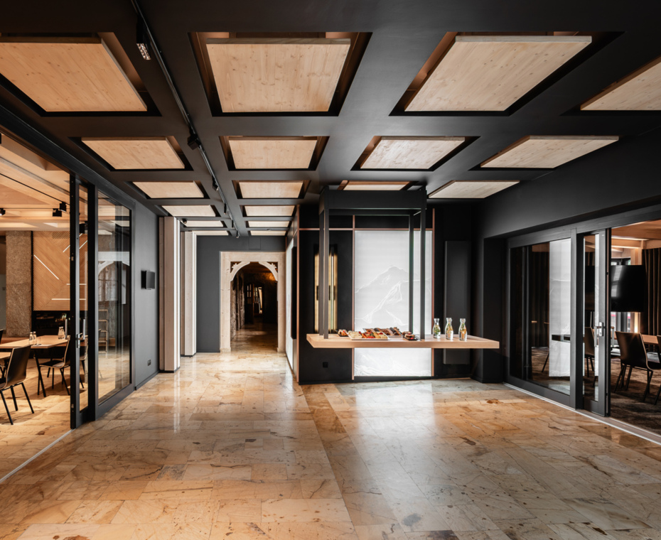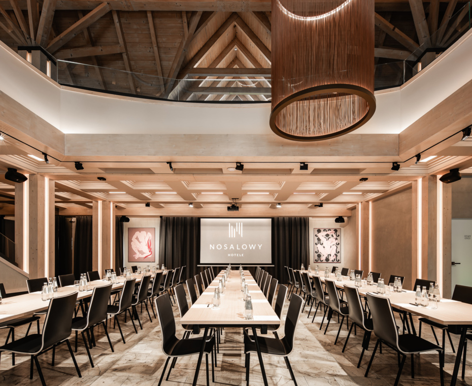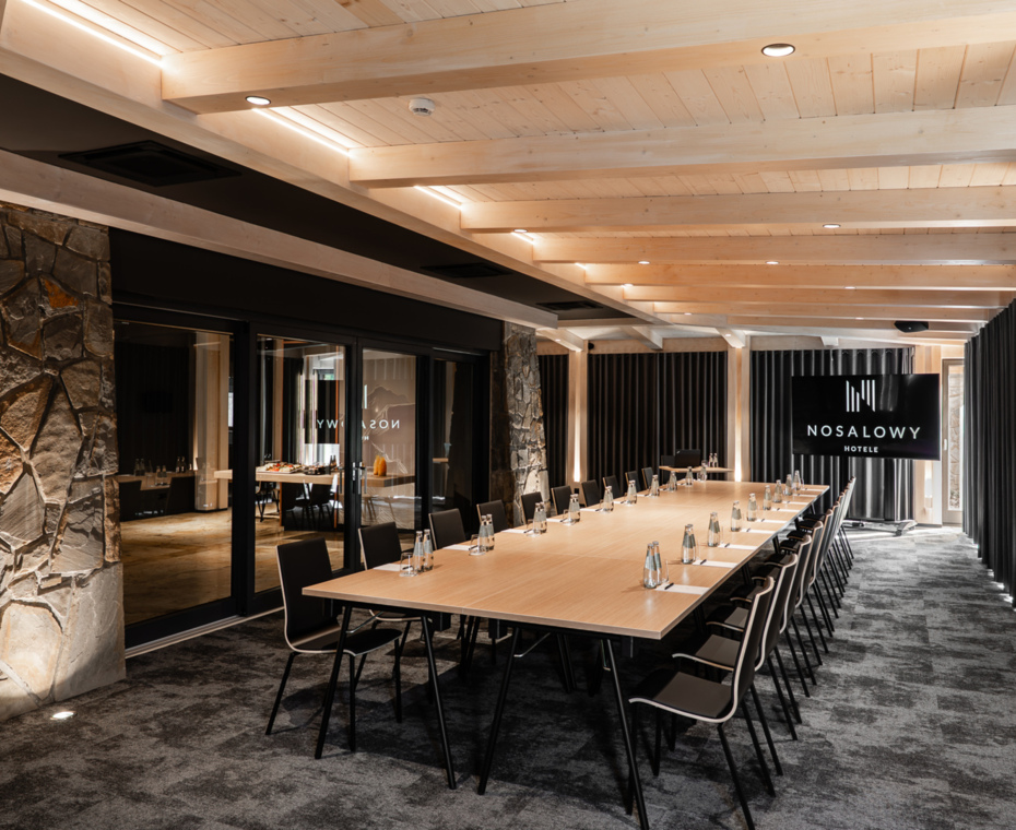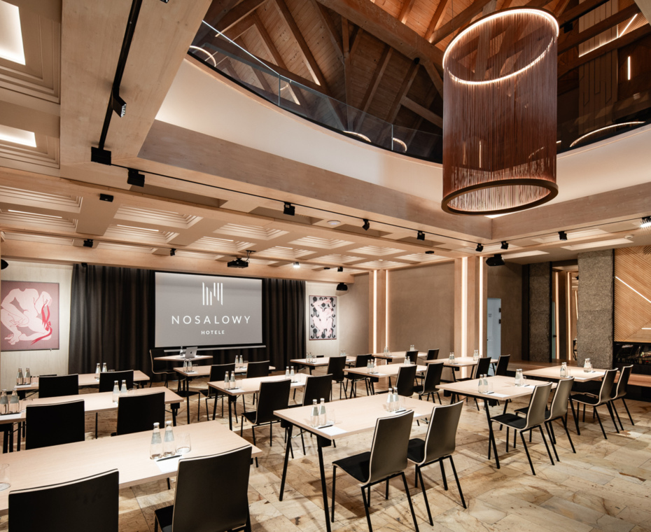 Two new, connected foyers, adjacent rooms, with an area of 100 and 80 sq m respectively with a mezzanine above the Nosal I Room, skillfully combine modern solutions required for organizing events with design inspired by Zakopane. Spacious, bright, with access to daylight, they are inspired by the climate of the mountains in a very modern and stylish edition. Huge glazing, fireplace, wood and stone (large granite slabs, hand-hewn by local stonemasons), comfortable chairs, stylish furniture and accessories and a designer mezzanine create an atmospheric space filled with the spirit of the Tatras. The latest technical, multimedia and sound solutions ensure the highest quality of event organization.