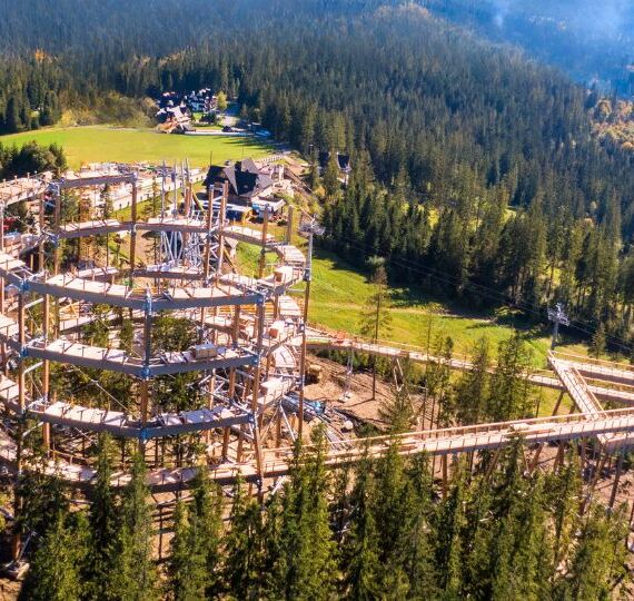 SkyWalk "Heart of Poronin" is a unique sky path offering panoramic views of the Tatra Mountains. Glass terraces, climbing nets, and slides provide excitement for the whole family. It’s a blend of nature, adrenaline, and highland charm at 44 meters above the ground.